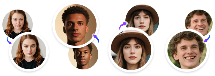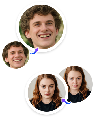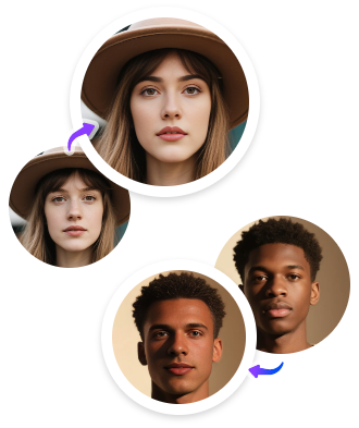 Resultados perfeitos de troca de rosto IA, mantendo expressões faciais naturais, clareamento e tons de pele.