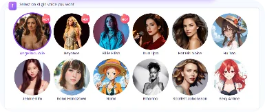 O gerador de voz de mulher oferece uma grande variedade de vozes de IA para você encontrar facilmente aquela que combina com o seu estilo, desde voz feminina mais grave, suave, madura, até estilos diferentes. Também pode criar vozes realistas ou no estilo anime, como se a personagem estivesse falando bem pertinho de você.
